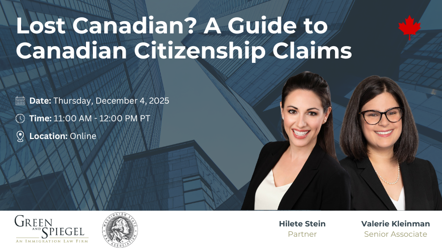 Partner and Permanent Residence Practice Director Hilete Stein and Senior Associate Valerie Kleinman, will be featured speakers at an upcoming Washington State Bar Association event exploring major recent developments in Canadian citizenship law.